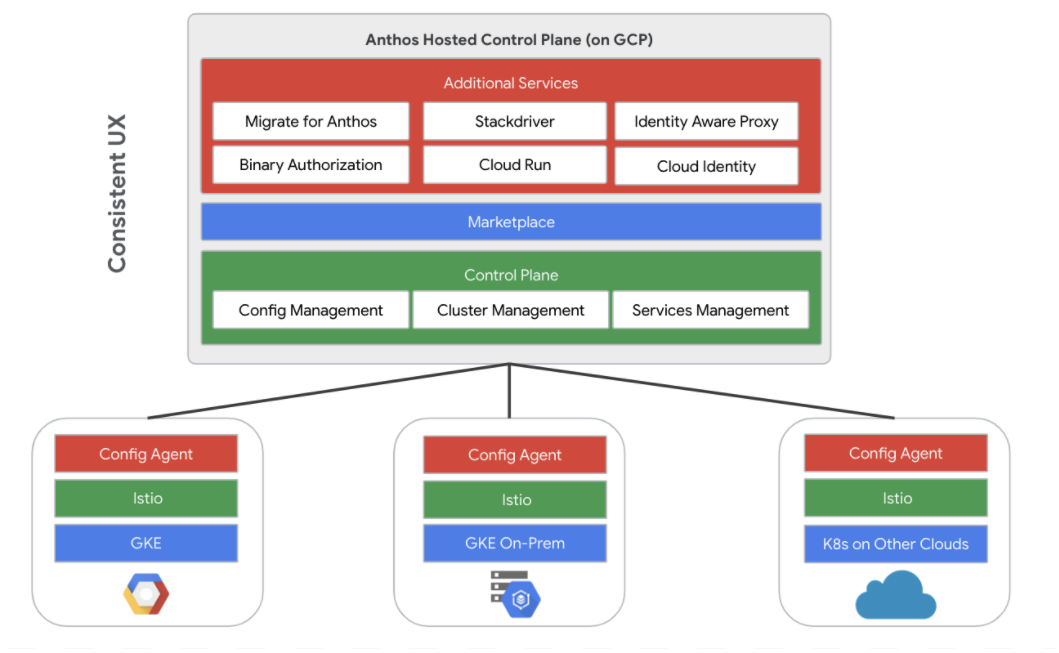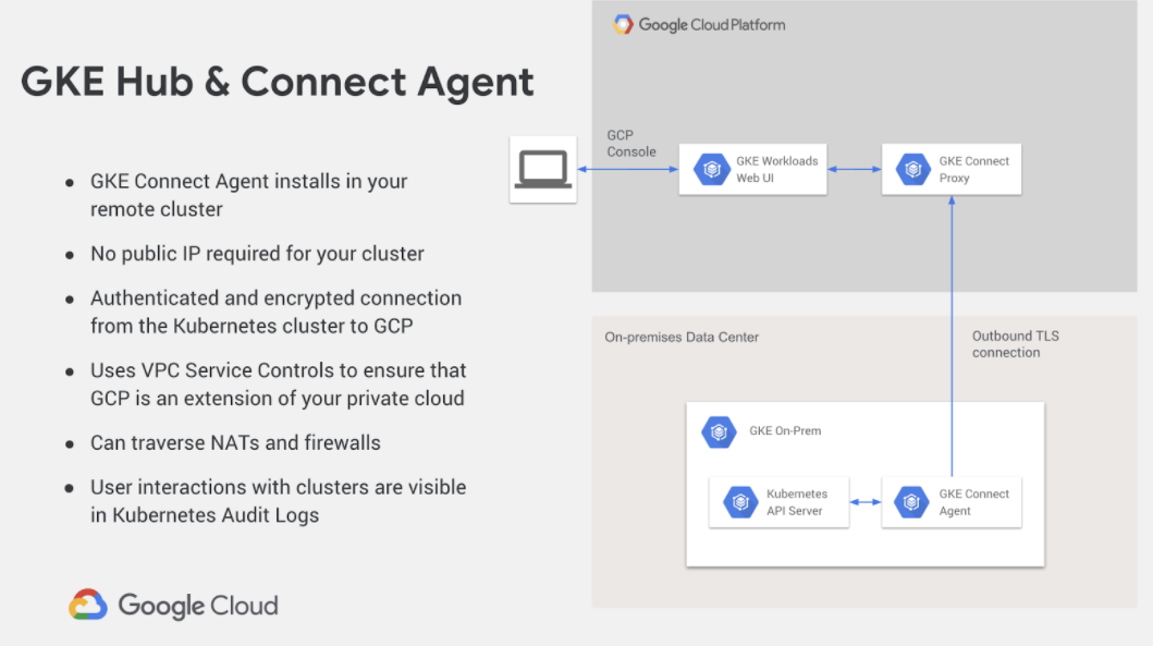 Anthos 对 On-Perm 和多云的 K8s 集群的管理采用了代理的方式,Anthos 会在每个加入 Anthos 的集群中安装一个 agent,由 agent 主动建立一个到 Anthos 控制面的连接,以穿透 NAT,连接建立后,Anthos 控制面会连接集群的 API Server,对集群进查看和行管理。