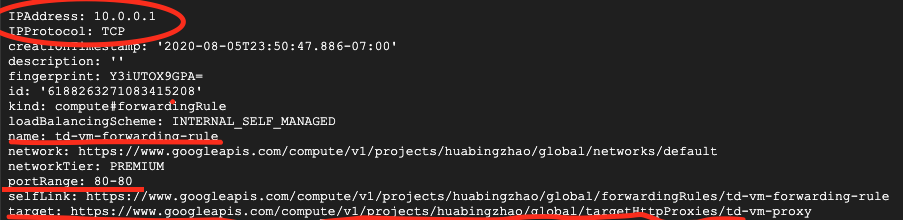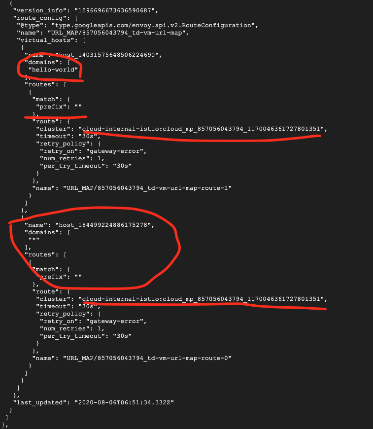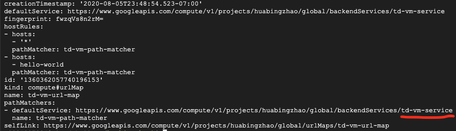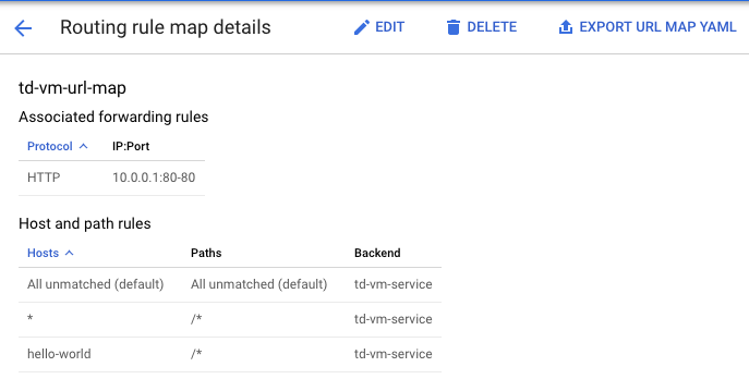 下图中的forwarding rule定义了一个暴露在 10.0.0.1:80 上的服务,该服务对应的url map 定义了两条路由规则,对应的主机名分别为 * 和 hello-worold,请求将被路由到后端的 td-vm-service backend service 中的服务实例。