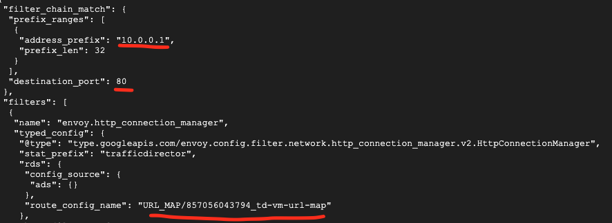 Listener 中的 Http Connection Manager filter 配置定义了 IP+Port 层面的入口,这里只接受 Forwarding Rule 中指定的 VIP 10.0.0.1。我们也可以在 Forwarding Rule 中将 VIP 设置为 0.0.0.0,这样的话任何目的 IP 的请求都可以处理。