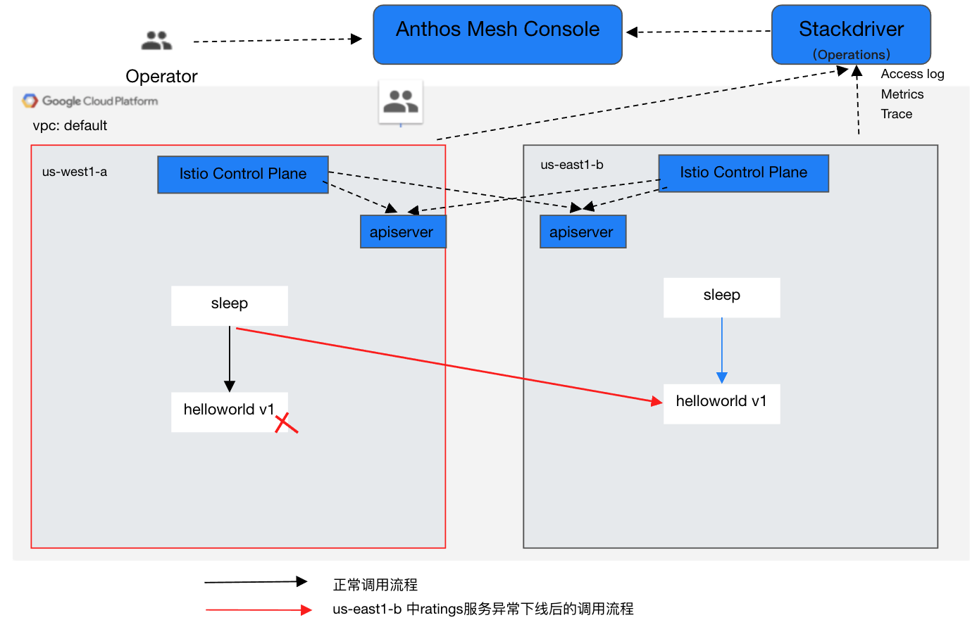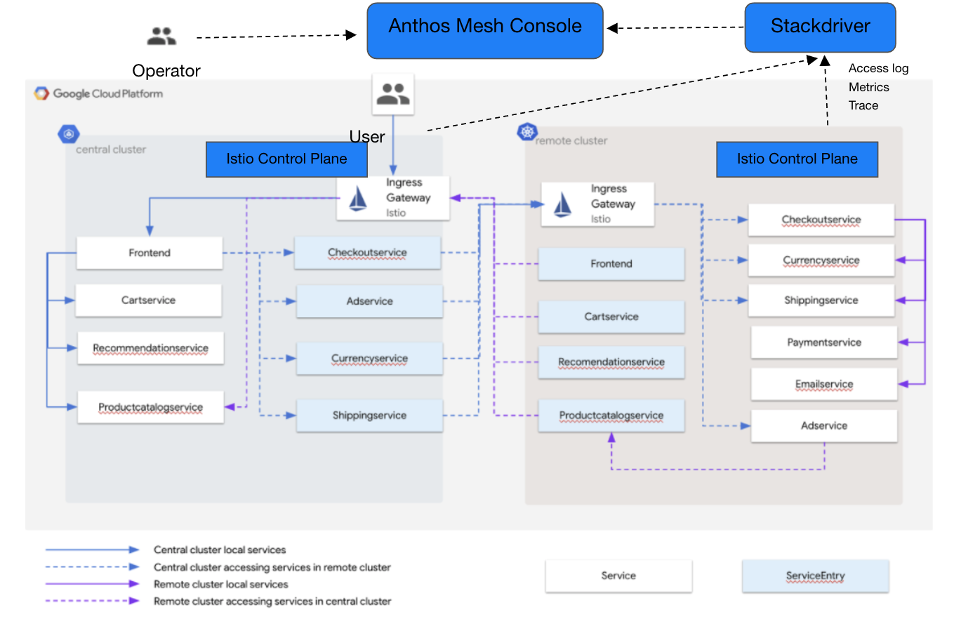 Metric,Access log和 tracing 过 Envoy stackdriver http filter 上报到 Google Cloud,以便通过 Anthos Service Mesh 控制台统一查看。