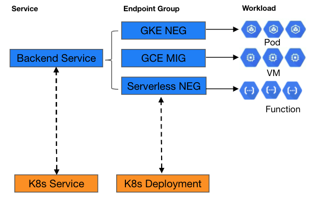 Traffic Director 的服务注册发现资源模型如下图所示,图中蓝色的图形为 Traffic Director 中使用的资源,桔色的图形为这些资源对应在 K8s 中的概念。Backend Service 是一个逻辑服务,可以看作 K8s 中的 Service,Backend Service 中可以包含 GKE 集群中的 NEG (Network Endpoint Group),GCE 虚拟机 的 MIG (Managed Instance Group),或者无服务的 NEG 。NEG 中则是具体的一个个工作负载,即服务实例。
