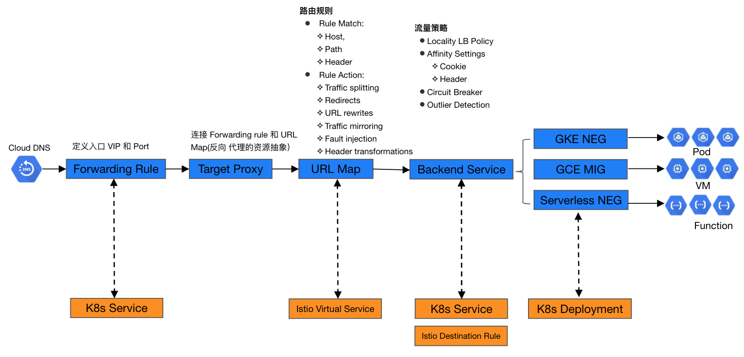 - URL Map:用于设置路由规则,包括规则匹配条件和规则动作两部分。匹配条件支持按照 HTTP 的 Host、Path、Header进行匹配。匹配后可以执行 Traffic Splitting、Redirects、URL Rewrites、Traffic Mirroring、Fault Injection、Header Transformation 等动作。