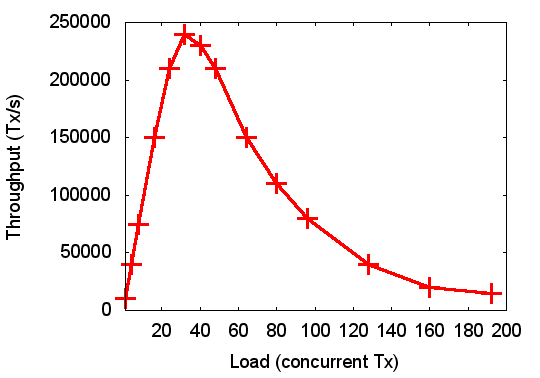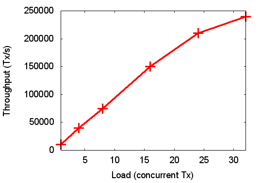 如果我告诉你这是在 32 核计算机上测得的,它仍然很好吗?然后,我们看到,只要每个核最多有一个客户端,吞吐量就几乎呈线性增长。现在,这不完全是数据库的典型负载。通常,单笔交易不足以保持单核繁忙。为了充分利用硬件,你将需要运行数据库,以便每个核平均有多个客户端。