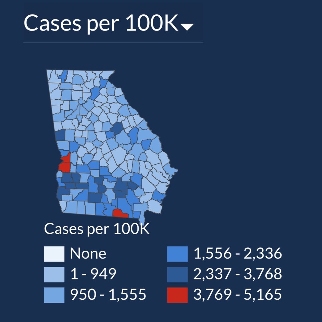 但是,相反的情况也可以成立,即使用数值范围来隐藏显著的变化。下面是一个很具有代表性的例子(感谢 Baris Kasikci 的提示):美国佐治亚州公共卫生部的 COVID-19 病例的每日更新会巧妙地调整数值范围,以使红色的数量(表示该县有很多人感染)变化不大。下面的两个图表分别来自 2020-07-02 和 2020-07-17 。