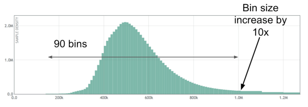 如上图所示,此对数线性直方图中包含每个幂为 10 的 90 个间隔。您可以看到 10k 到 1M 之间分布的 90 个间隔。在每个 10 的幂下,间隔的大小增加 10 倍。这使得我们能够以高相对精度记录各种各样的值,而不需要提前知道数据分布。让我们看看当我们覆盖一些百分点时,这看起来像什么:
