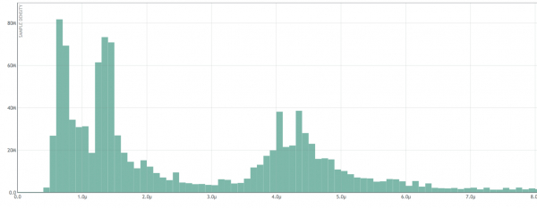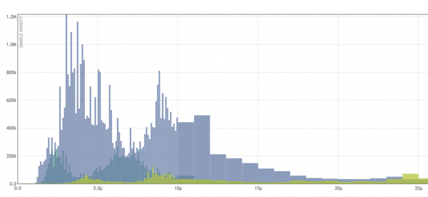 上图是使用直方图以微秒为单位显示服务延迟数据的可视化表示。样本数量位于 Y 轴上,样本值(在本例中为微秒等待时间)位于 X 轴上。这是我们在 Circonus 开发的开源直方图。(请参阅 C 语言 和 Golang 中的开源代码,或者在此处阅读有关直方图的更多信息)还有一些开源的直方图实现,如 Ted Dunning 的 t-消化直方图和 HDR 直方图。
