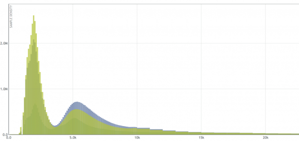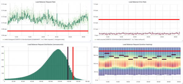 这是一个 heapmap,它代表一组随时间变化的直方图。想象一下,这个热图中的每一列都有一个从上面看的单独的条形图,颜色用于指示每个间隔的高度。这是来自 10 个负载均衡器集群的响应延迟的 grafana 可视化。这使我们能够深入了解整个集群的系统行为,一周之内就有超过 100 万个数据样本。这里的中位数大约在 500 微秒左右,以红色带表示。