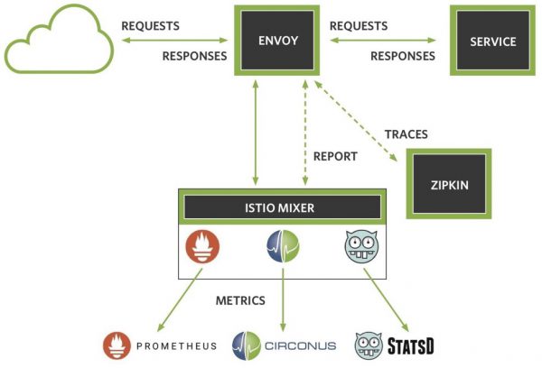 Istio 支持多种适配器将数据发送到各种监控工具。包括 Prometheus、Circonus 或 Statsd。您也可以同时启用Zipkin 和 Jaeger 追踪。而且,您可以把可视化所涉及的服务生成图形。