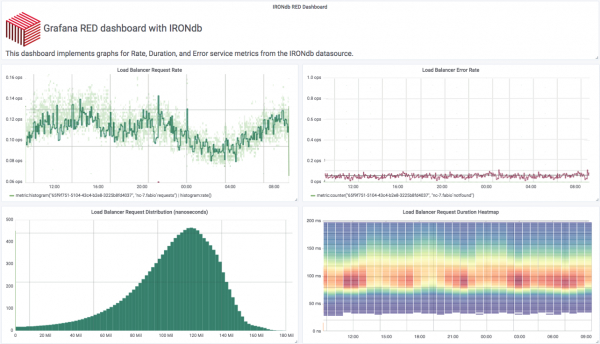 上面的屏幕截图是修改后的 RED 仪表板,显示基于分布的延迟数据。在左下角,我们显示了一个固定时间窗口上的延迟直方图。在它的右边,我们使用热图将分布分解成更小的时间窗口。利用 RED 仪表板的布局,我们可以通过几个小组信息全面了解我们的服务是如何运作的。这个特定的仪表板是使用 Grafana 实现的,使用 IRONdb 时间序列数据库服务,该数据库本地存储延迟时间数据作为对数线性直方图。