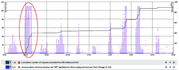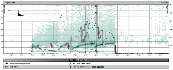 在此屏幕截图中,我们已经圈出了发生速度降低的热图的一部分。增加的延迟分布是相当缓慢的指示。图中的线表示受到一段时间影响的请求总数。