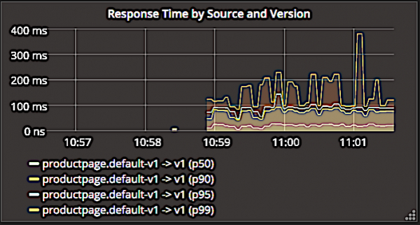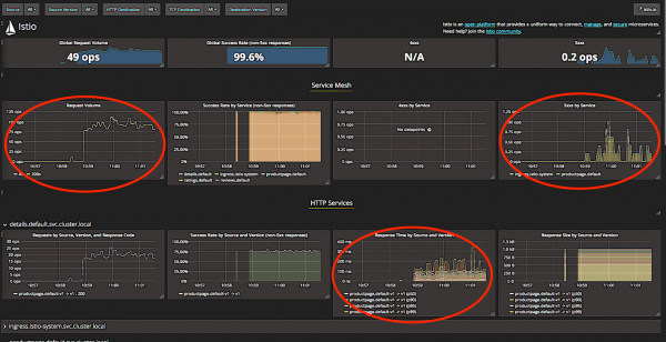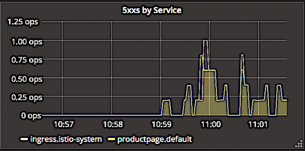 Istio 仪表板为返回 5xx 错误代码的响应做了类似的操作。在上面的屏幕截图中,您可以看到它如何通过 ingress controller 或 productpage 页面本身的错误来分解错误。