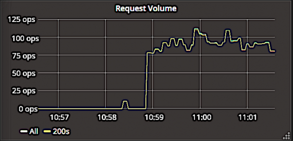 该屏幕截图显示了请求持续时间图。此图是关于我们服务的健康状况的最丰富信息。这些数据由 Prometheus 监测系统提供,因此我们可以看到请求时间百分点,包括中位数,第90,95和第99百分位。