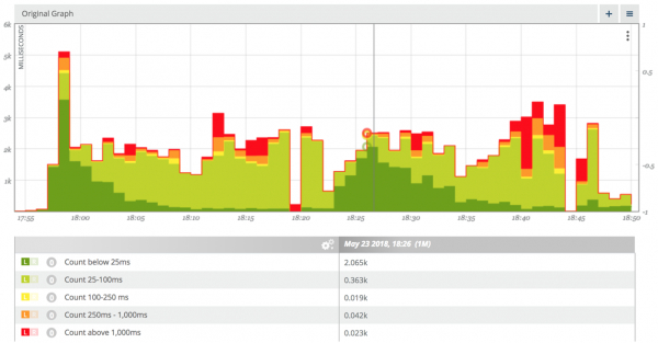 上面的可视化显示延迟分布随着时间的推移被延迟带分解。这里的频段显示 25ms 到 100ms,100-250ms,250-1000 和 1000ms 以下的请求数。快速的请求分组以绿色显示,请求速度的请求变慢以红色显示。