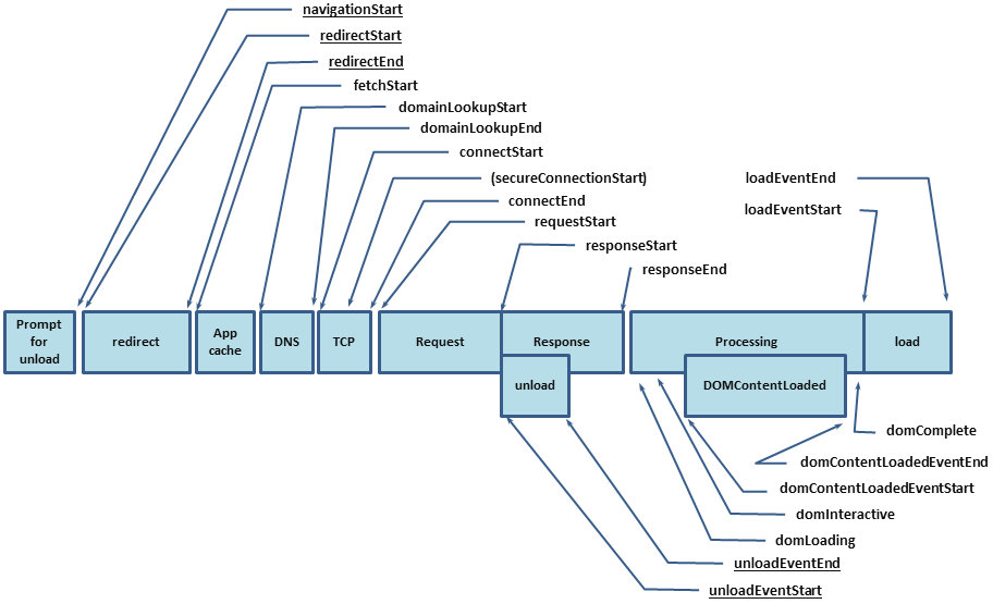 在 skywalking-client-js 中,所有的性能指标都是根据 W3C 规范中定义的 Navigation Timing API 来计算的。我们可以使用 window.performance.timing 属性获得一个描述页面的 PerformanceTiming 对象。PerformanceTiming 接口包含的属性提供了当前页面加载和使用过程中发生的各种事件的性能计时信息。