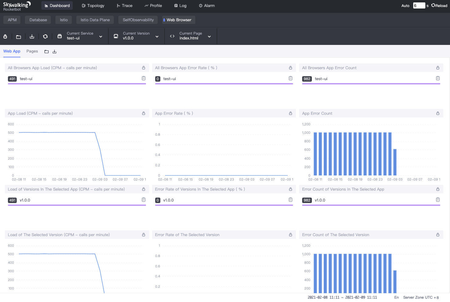skywalking-client-js 收集这些性能指标,并发送给 OAP(Observability Analysis Platform)服务器,服务器在后台汇总数据,然后在 UI 端以可视化的方式展示出来。用户可以根据这些数据来优化页面。