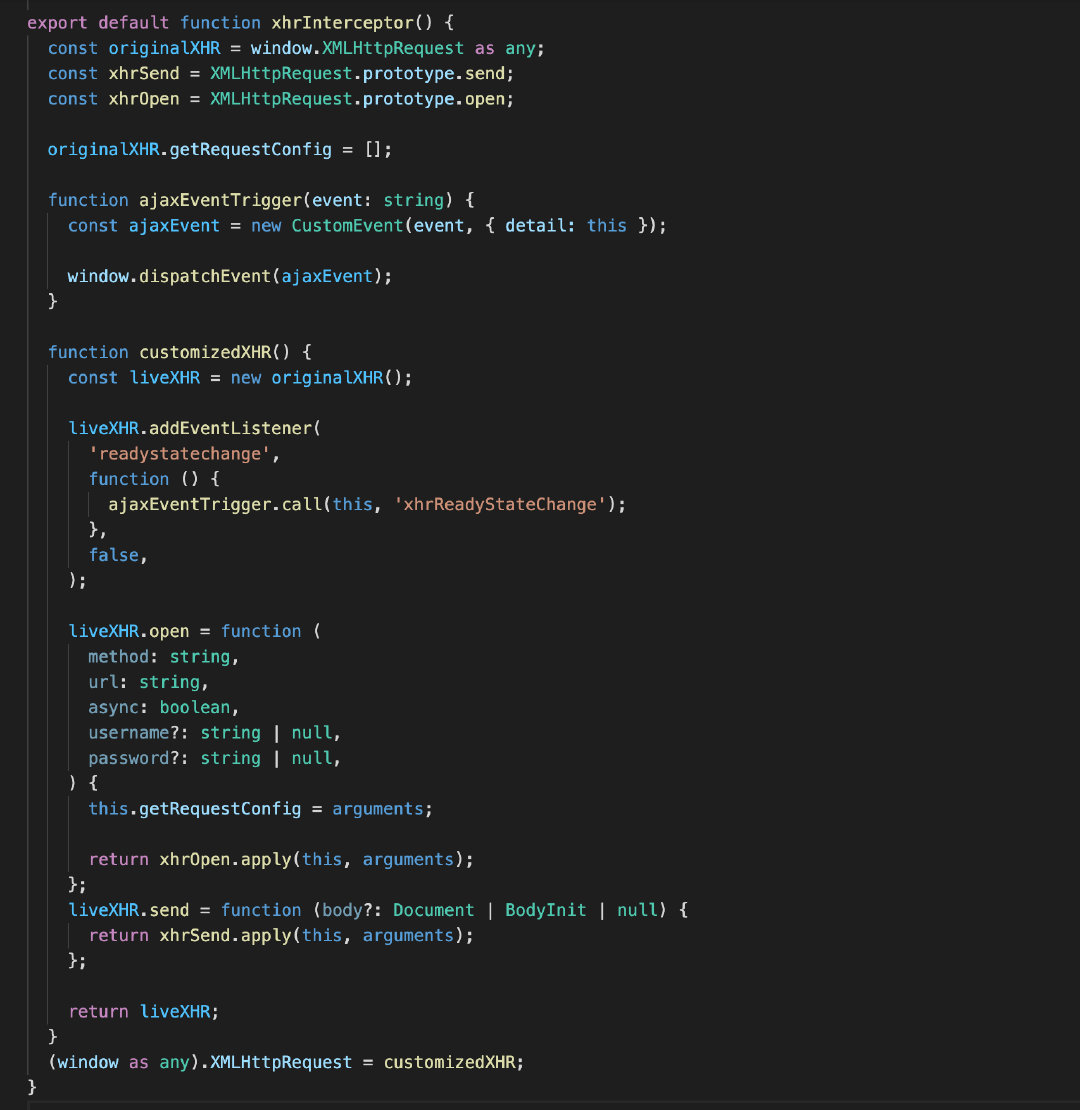 如你所见,它创建了一个 Promise 和一个新的 XMLHttpRequest 对象。由于 fetch 的代码是内置在浏览器中的,它必须先监控代码执行。因此,当我们添加监听事件时,我们无法监控 fetch 中的代码。只是在监控完代码执行后,我们重写一下 fetch: import {fetch} from 'whatwg-fetch'; window.fetch = fetch; 这样,我们就可以通过上面的方法拦截 fetch 请求了。
