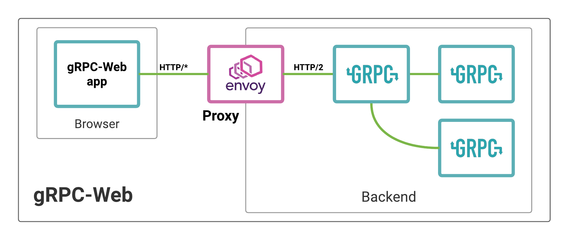 下图中展示了Envoy结合gRPC-Web使用。图中Web App调用了一个gRPC服务,该服务又依赖另外两个gRPC服务。Envoy 将 HTTP/1.1 请求转换成 HTTP/2 请求。底层其实还是需要进行HTTP协议的转换,但客户端和服务端都不需要考虑HTTP层的问题。
