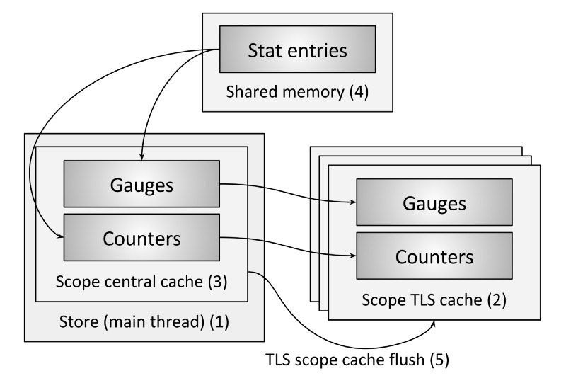 - 线程本地原子缓存: 在worker数量和吞吐量极高的情况下,单个stat值上的原子争用将成为一个问题。这可以通过移动到TLS计数器和压力表来解决,这些计数器和压力表在冲洗之前被聚集到中央存储中。
