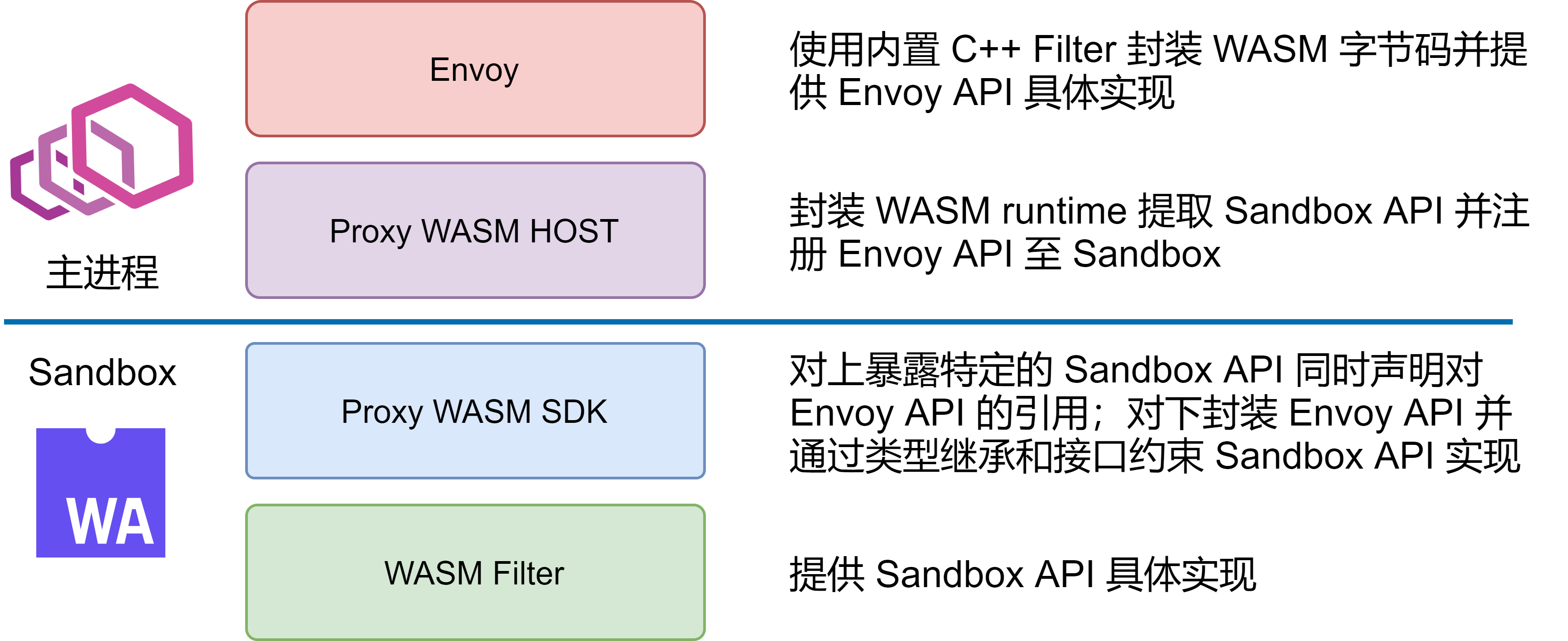 - 对 Envoy 主进程:暴露特定的沙箱 API 同时声明对 Envoy API 的引用;