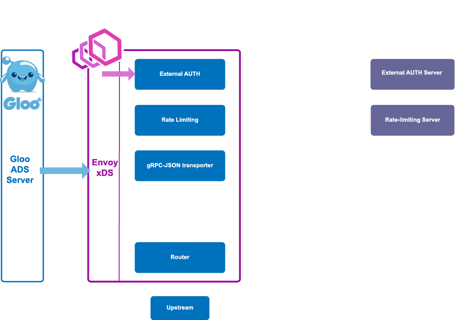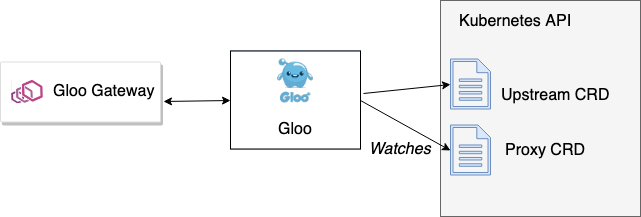 您可以看到Proxy对象指定监听器、类型以及路由信息。如果您仔细观察,您会发现它在一定程度上遵循Envoy的配置,但在支持附加功能方面有所不同。在路由中,您可以看到请求被发送到“Upstream”。Gloo知道如何路由到Upstream,您可以在上面的Proxy对象中看到这些定义。Proxy对象是由Gloo的控制平面转换为Envoy xDS API的对象。您会看到如下的Gloo的组件:
