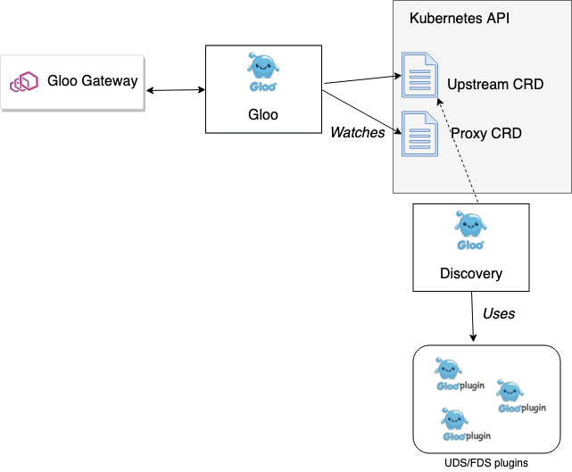 Gloo控制平面中的discovery组件仅使用其UDS和FDS服务来发现Upstream对象并将其写入Kuberentes CRDs。从这里,用户可以创建从Envoy代理上的特定API路径到Upstream上的特定函数的路由规则。Envoy代理不直接与这个控制平面组件交互(请回忆一下,Envoy只使用gloo组件公开的xDS API)。相反,discovery组件促进了向Upstream的创建,然后可以由Proxy对象使用。这是一个使用支持微服务(本例中的discovery服务)来为控制平面的整体功能做出贡献的好例子。