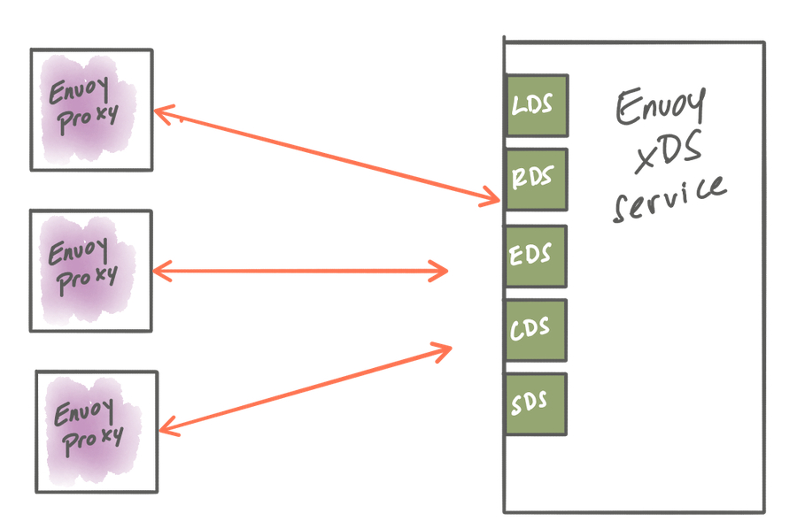 最后,一些Envoy管理实施选择生成 静态Envoy配置文件, 并定期替换Envoy磁盘上的配置文件,然后执行 Envoy进程 的 热重新加载 。 在高度动态的环境中(如Kubernetes,但实际上是任何基于ephemeral-compute的平台),此文件生成,交付,热重启等的管理可能变得难以处理。 Envoy最初是在一个执行此类更新的环境中运行的(Lyft,它是在哪里创建的),但它们逐渐转向使用xDS API。