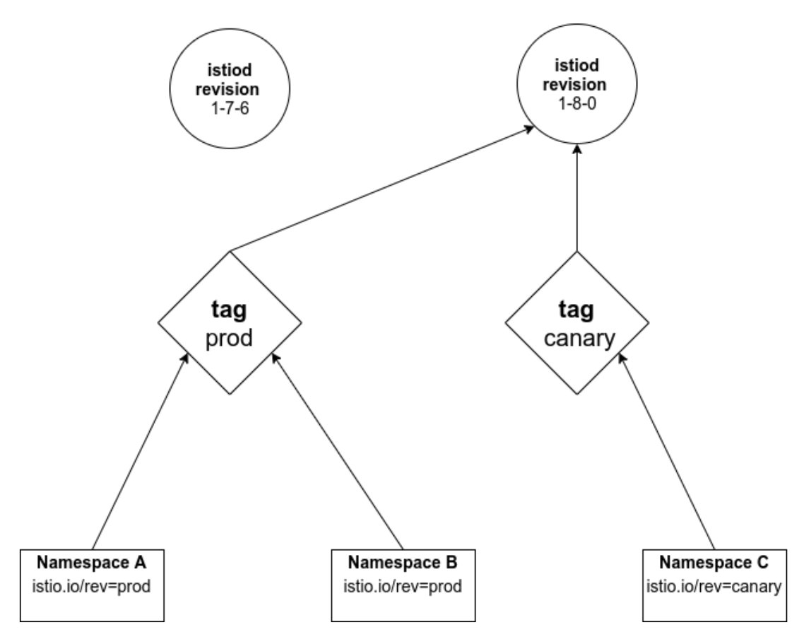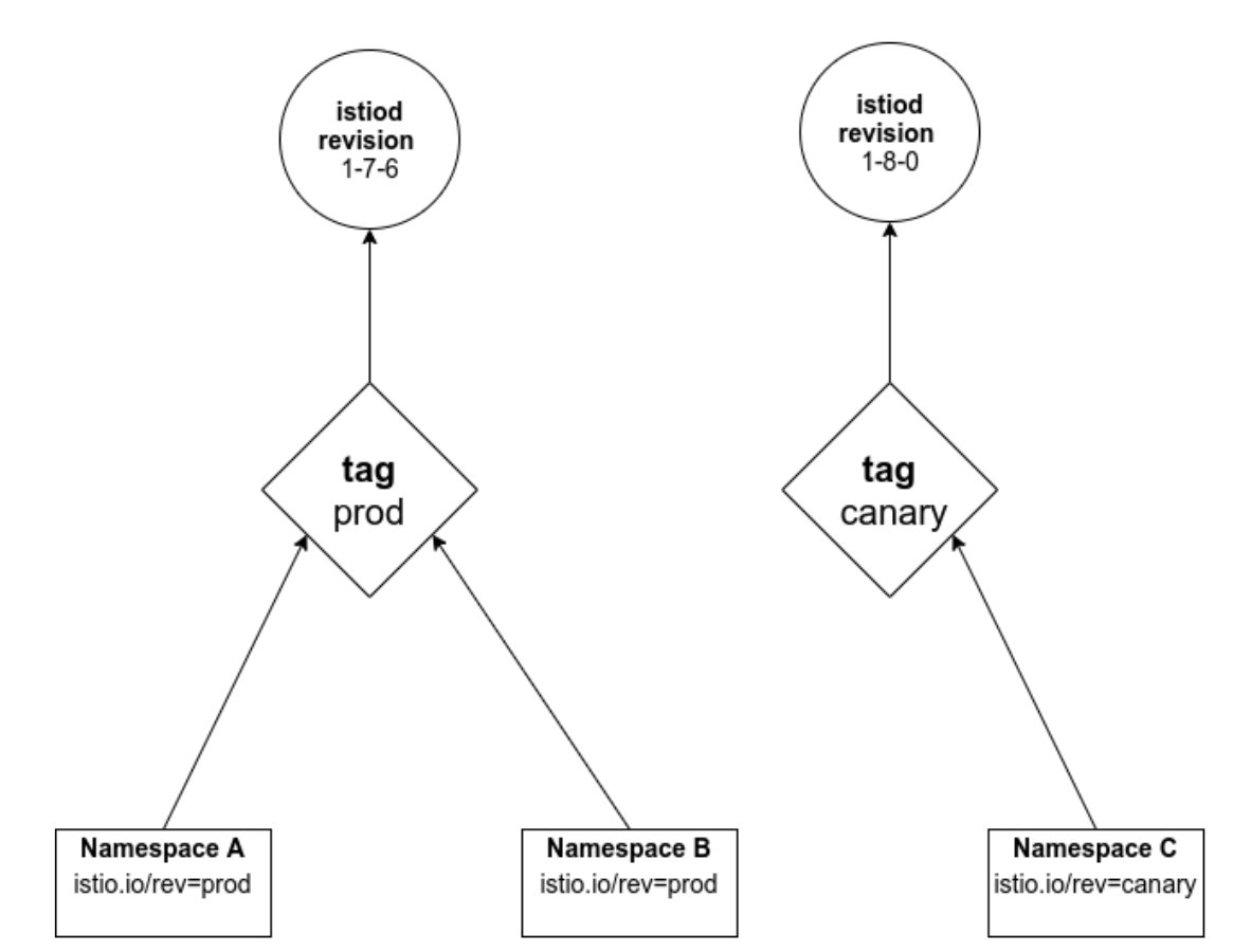 有了修订版标签,现在有了一个间接层:你可以创建像 canary 和 prod 这样的标签,把使用这些标签的命名空间标记为修订版(即 istio.io/rev=prod),并把特定的 Istiod 修订版与该标签联系起来。