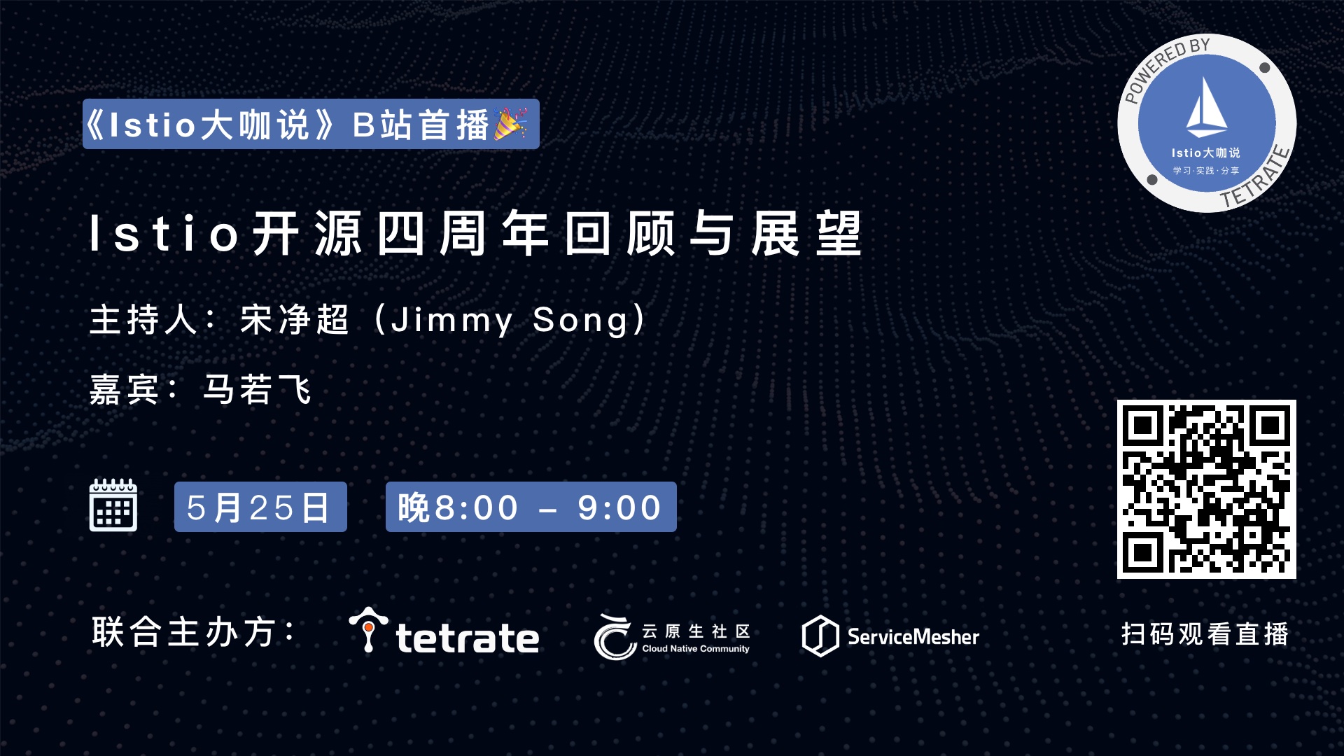 想了解 Istio 的来历吗?想知道 Istio 自我救赎般的架构重构吗?想窥探 Istio 开发背后的趣事吗?想一起解读最新版本的新特性吗?北京时间 5 月 25 日晚上 8 点,相约 B 站,让我们一起回顾 Istio发布四周年的点点滴滴,B 站直播间不见不散!