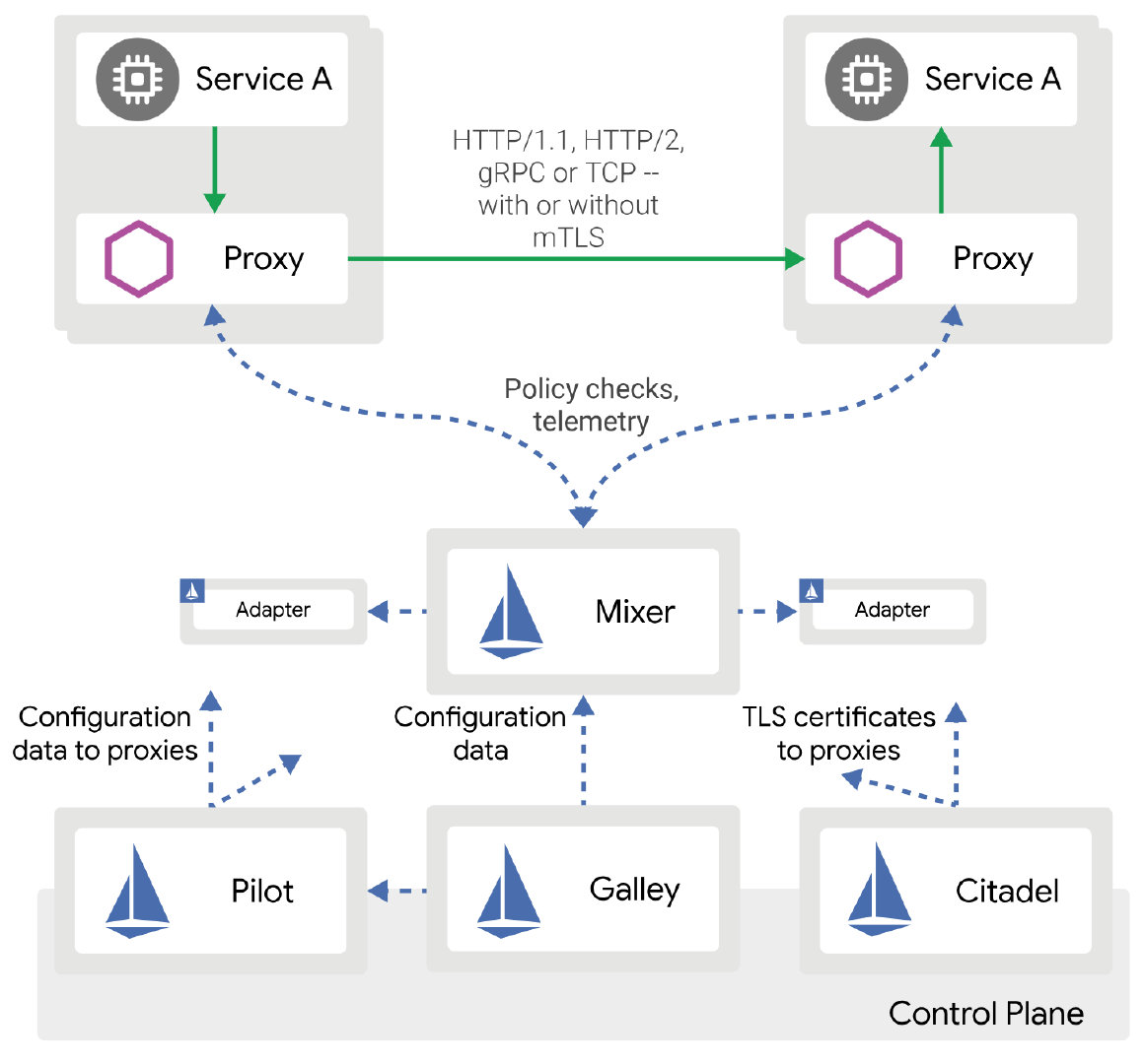 - mixer client: 测量和遥测相关的客户端实现, 基于Envoy做扩展,通过RPC和Mixer server 进行交互, 实现策略管控和遥测