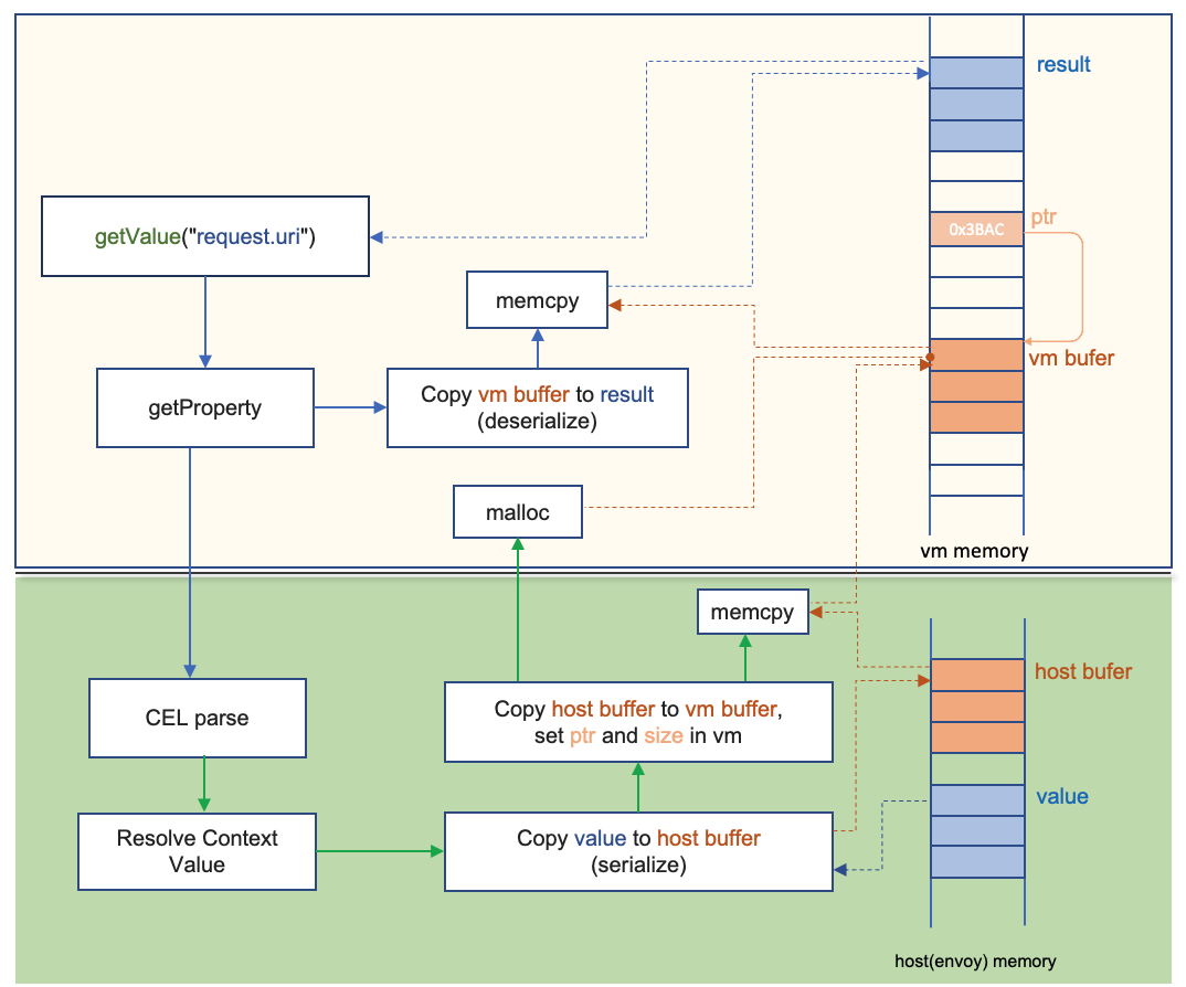 首先,Wasm 扩展机制跟 Envoy host 环境是通过内存拷贝的方式进行通信,这是 Wasm 虚拟机的隔离性机制决定的。Envoy 为了保持架构灵活性的同时保证性能,使设计了一个非 Wasm 虚拟机运行扩展(如 stats extension)的模式,即 NullVM 模式,它是一个假的 Wasm 虚拟机,实际上运行的扩展还是被编译在 Envoy 内部,但它也逃离不掉 Wasm 架构带来的内存拷贝影响。