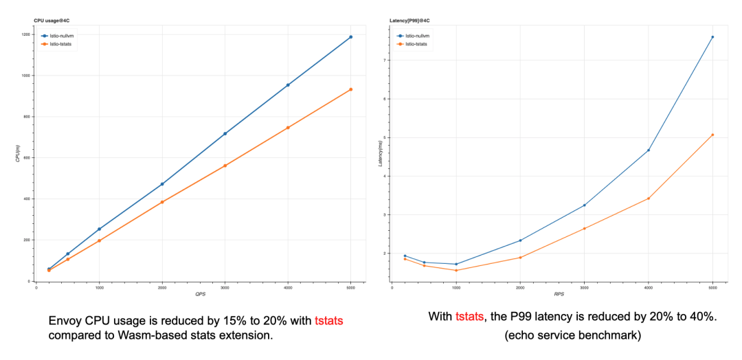 那么如何去优化呢?简单对 Wasm 插件优化是没有太大帮助,因为它的底层 Wasm 机制已经决定了它有不少的性能损耗,所以我们就开发了一个新的遥测插件 tstats。tstats 使用 Envoy 原生的扩展方式开发。在 tstats 扩展内部,实现了遥测和 metadata_exchange 的结合,消除了 Wasm 带来的性能弊端。Tstats 遥测与社区遥测兼容,生成相同的指标,tstats 基于 istio 控制面的 EnvoyFilter CRD 进行部署,用户可以平滑升级,当用户发现 tstats 的功能没有满足需求或者出现一些问题时,也可以切换使用到社区提供的遥测扩展。