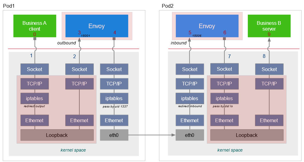 首先,我们看一下 istio 数据面的通信模型,来分析一下为什么会对延时有这么大的影响。可以看到,相比于服务之间直接通信,在引入 istio 之后,通信路径会有明显增加,主要包括多出了两次本地进程之间的 tcp 连接通信和用户态网络代理 envoy 对数据的处理。所以我们的优化也分为了两部分进行。