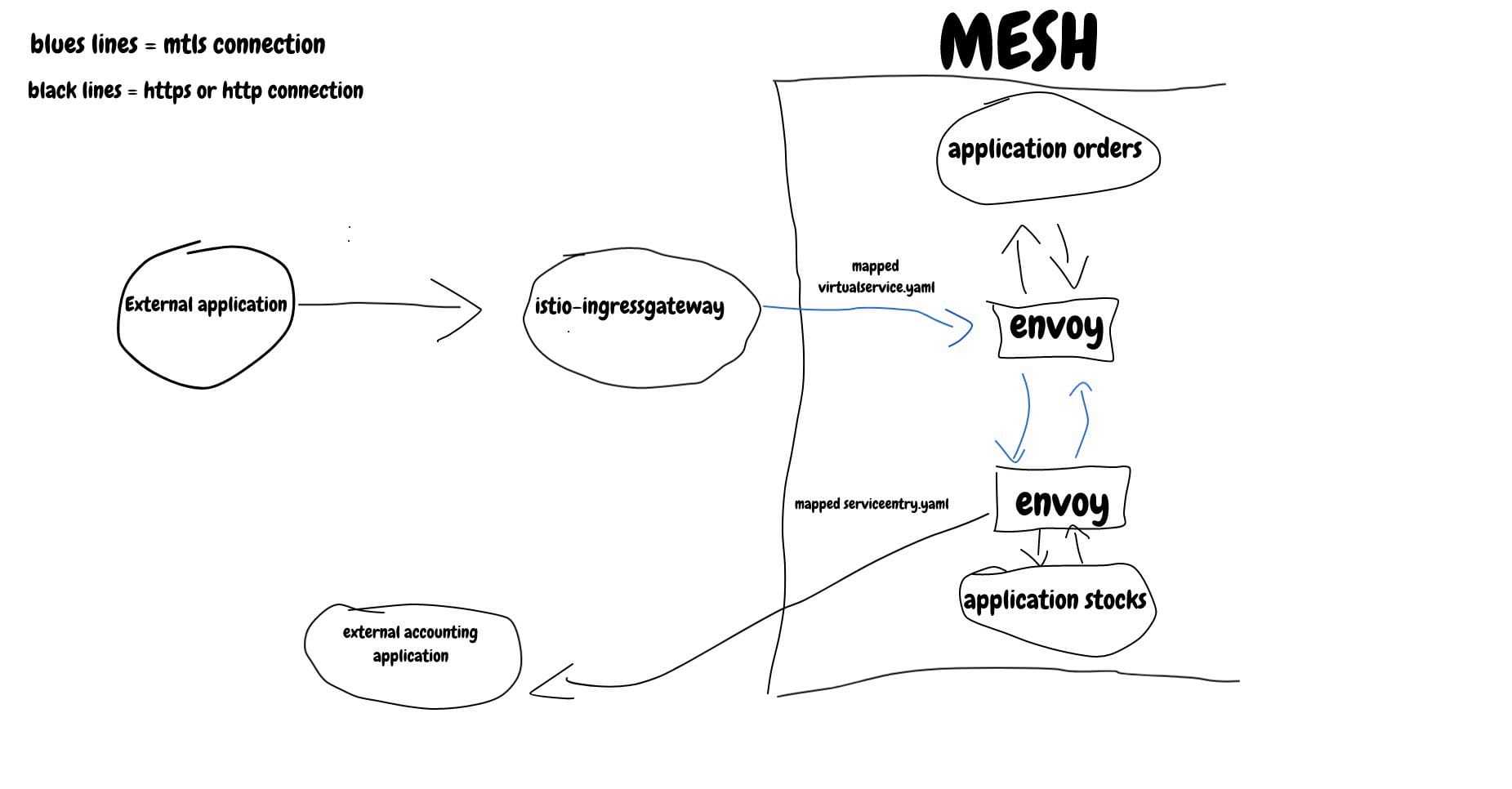 现在我们的环境已经运行起来,让我们思考一下应用程序是如何相互通信的。在网格中的服务通过 envoy 来处理双向通行和负载均衡以达到服务间相互通信。那些不在网格中的服务该如何处理呢?你可能想知道他们如何与我们的服务进行沟通,我们的服务如何与网格外部的服务进行通信。这就是我们配置入口的地方。下图将说明外部服务如何与网格内的应用进行联系的:
