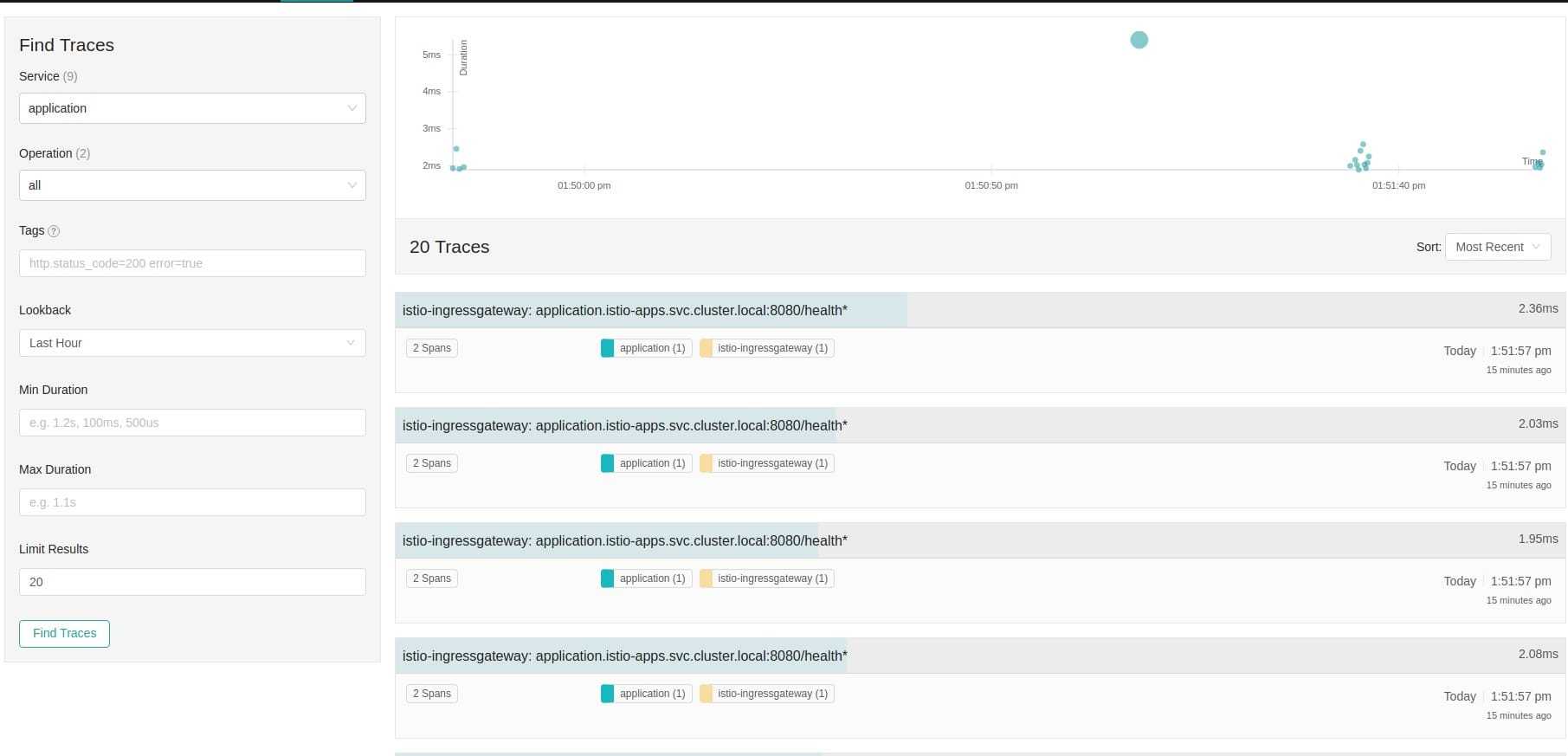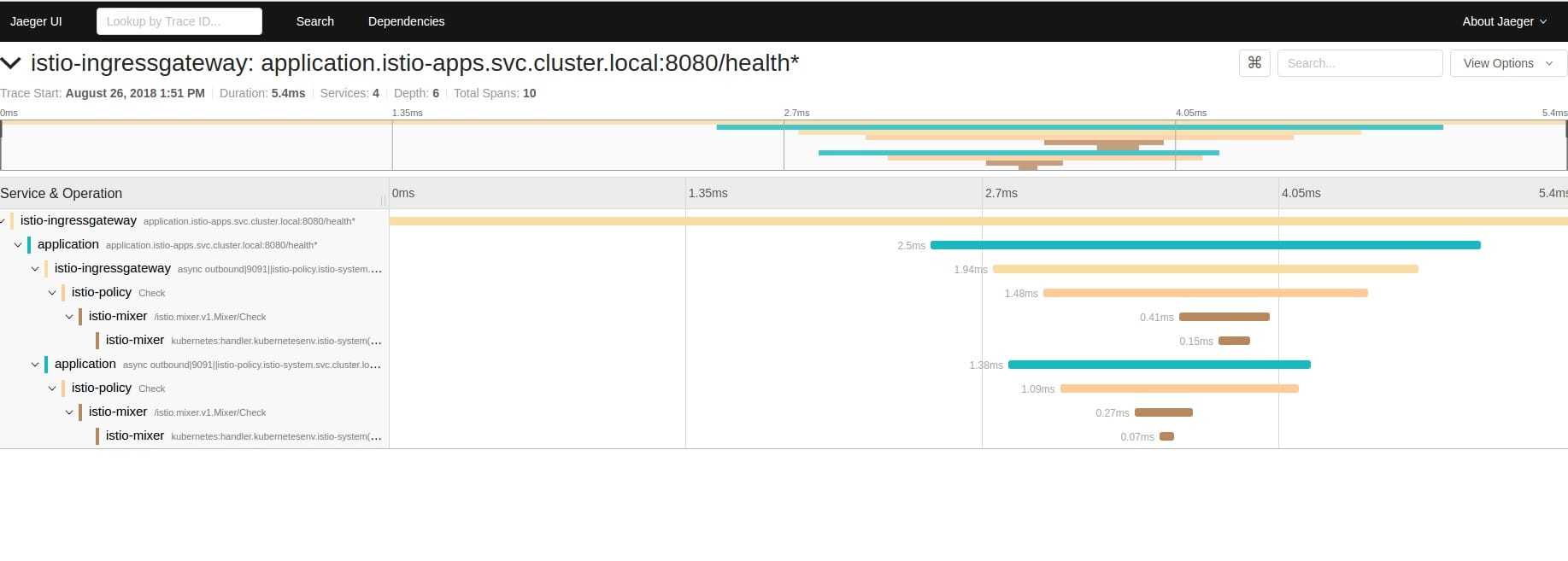 Jaeger 是一个功能强大的监控工具,可以用来监听请求到执行情况以及请求在每个部分中执行的时长。但是,你需要注意的是,如果你需要使用它更多的潜在功能,你需要适当的调整你的代码来传播 Istio injected 的头。如果你需要了解更多关于请求的信息,你需要使用一些工具(例如:opentracing)来获取应用程序内部功能调用的度量数据。