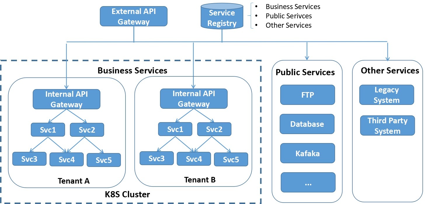 根据PaaS的部署场景,系统可以采用1级或者2级API Gateway进行请求分发。单租户场景下采用1级API Gateway;多租户场景下可采用2级API Gateway。第一级的Gateway在K8S集群外,是整个系统的总入口,负责分流K8s不同租户以及外部服务的流量。第二级Gateway在K8S租户中,是租户内服务的请求入口。两级API Gateway都从Service Registry获取服务信息,考虑到安全和效率因素,每个Gateway只能拉取和自己负责部分的服务信息。