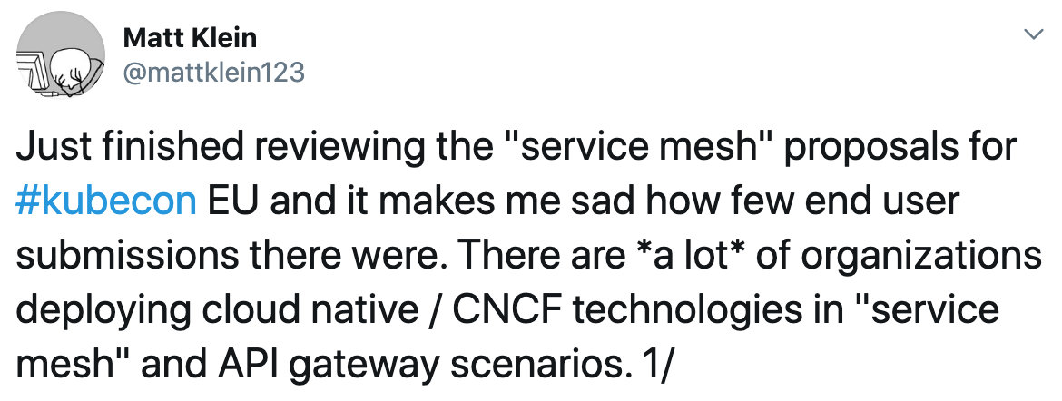 任何一个系统都是由一粒种子成长为参天大树的,Istio 也不例外。唯一不同的是,它从 0.1 版本刚刚问世就已经枝繁叶茂,功能强大,胸怀宇宙。我们现在很难评断当初的设计是不正确的。但 2 年的市场检验已然说明了问题,完善和强大在某种程度上就是复杂和易用性的缺失,Istio 的落地项目少的可怜。Envoy(Istio的御用数据平面)的缔造者 Matt Keiln 在自己的 Twitter 上评价了 Service Mesh 的落地情况,他用带引号的反语表达了自己的无奈: