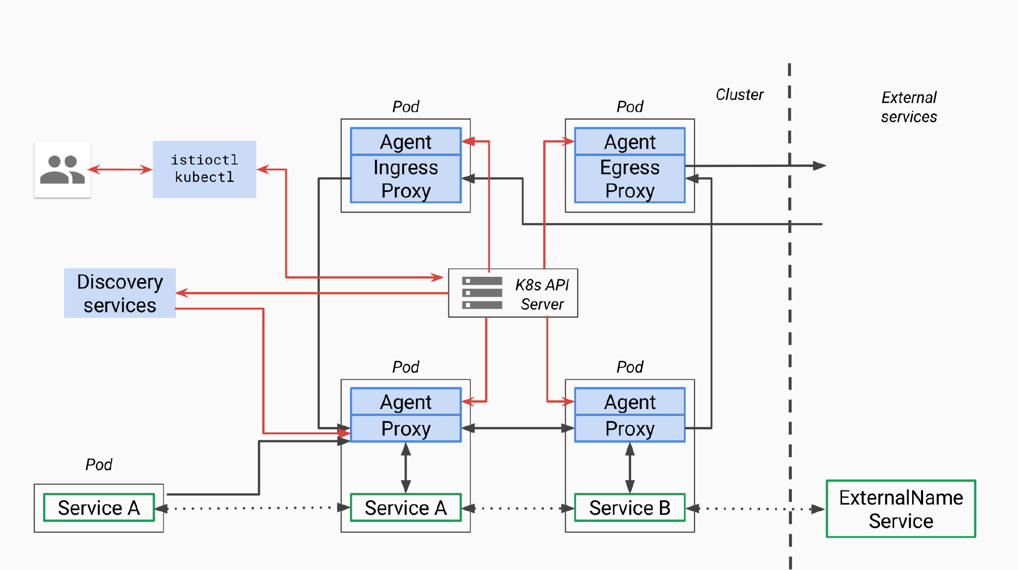 - service A/B:使用了istio的应用,如Service A/B,的进出网络流量会被proxy接管