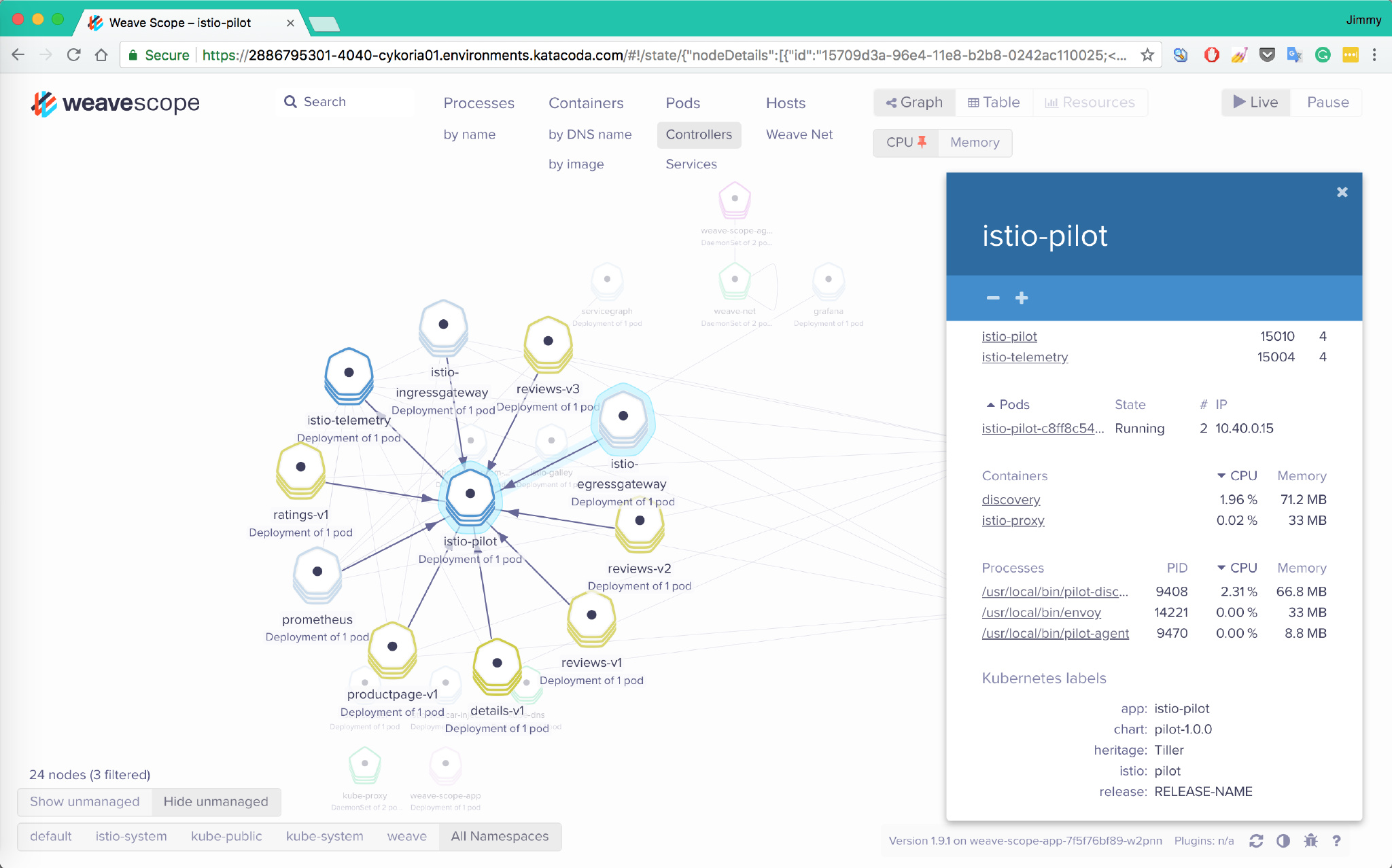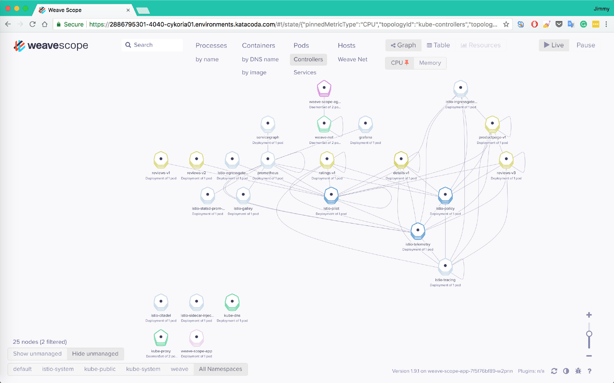 只要傻瓜式操作就可以部署一个Istio出来,同时还提供了Weave scope可以对service mesh的中的服务关系做可视化呈现。