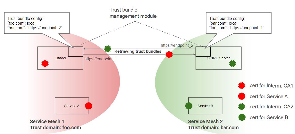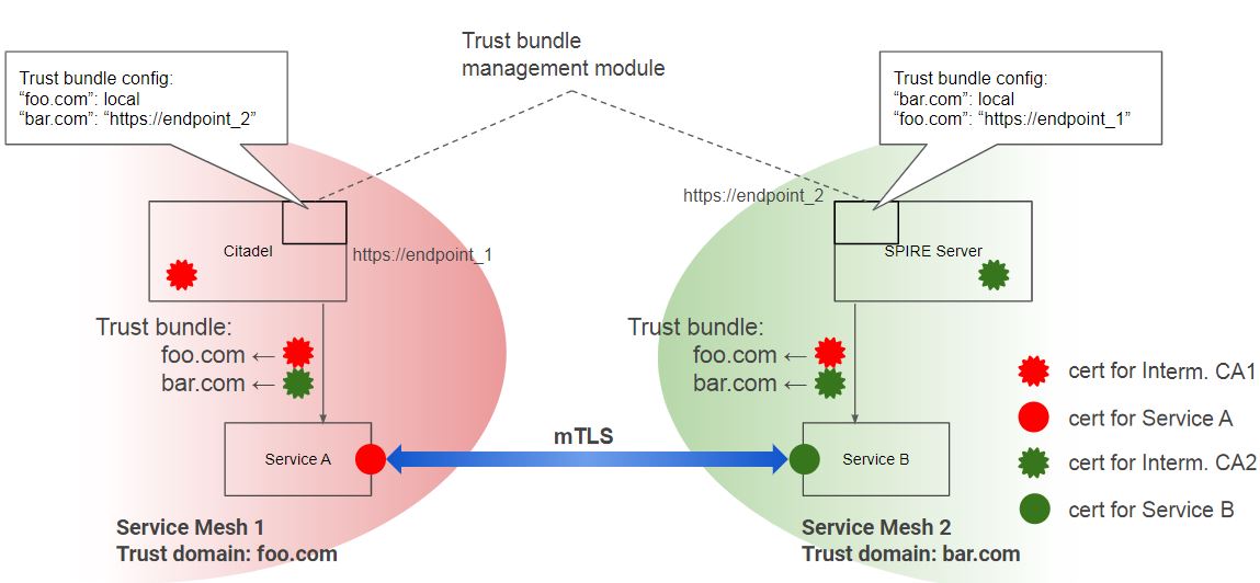 介绍了一种多个Istio集群(或称为信任域)之间建立相互信任的机制。该机制可以解决跨集群的服务访问的身份认证问题。其基本思路是在两个信任域之间相互交换证书信息,然后使用得到的证书信息对对方的服务进行身份认证。