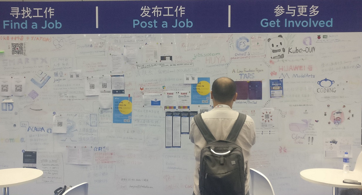 会场上专门设立了一面job board,可以在上面张贴求职信息或者招聘信息。从内容来看,大部分是和云原生相关的工作岗位,集中在北上深地区。找了很久,没有看到成都的招聘信息,看来成都虽然是西南IT行业的中心,但离北上深还是有不小差距。