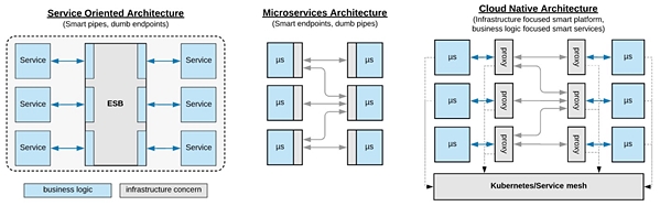 与 ESB 的不同之处在于,与服务网格不同的是,只有一个集中路由层,每个微服务通常都有自己的路由器—— 一个带有附加中央管理层的代理逻辑的 sidecar 容器。 更重要的是,管道(平台和服务网格)没有任何业务逻辑;它们完全专注于基础架构方面,使服务专注于业务逻辑。 如图所示,这代表了 ESB 和微服务学习的演变,以适应云环境的动态和不可靠特性。