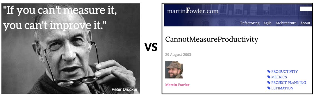 关于这个问题,业界有两派截然不同的观点,一派是以现代管理学之父 Peter Drucker 的理论为依据,主张研发效能能够度量的;另一派是以世界级软件开发大师 Martin Fowler 为代表,主张研发效能不可度量的。
