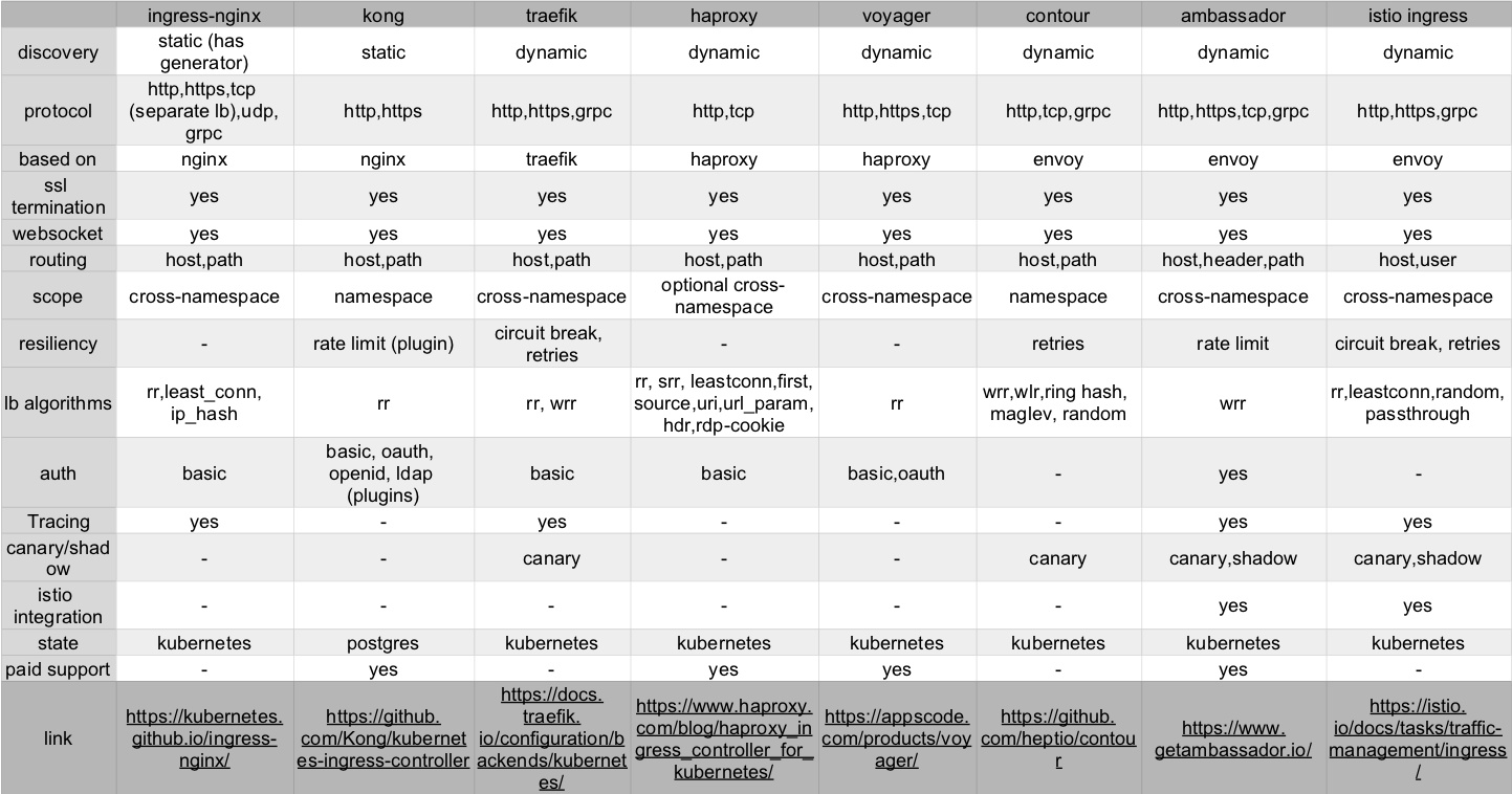 据我所知,这是kubernetes可用网关的最完整的列表。从技术上来讲,Ambassador不是ingress,但是它表现地已经非常好了。你可能已经看到了我制作的大表。