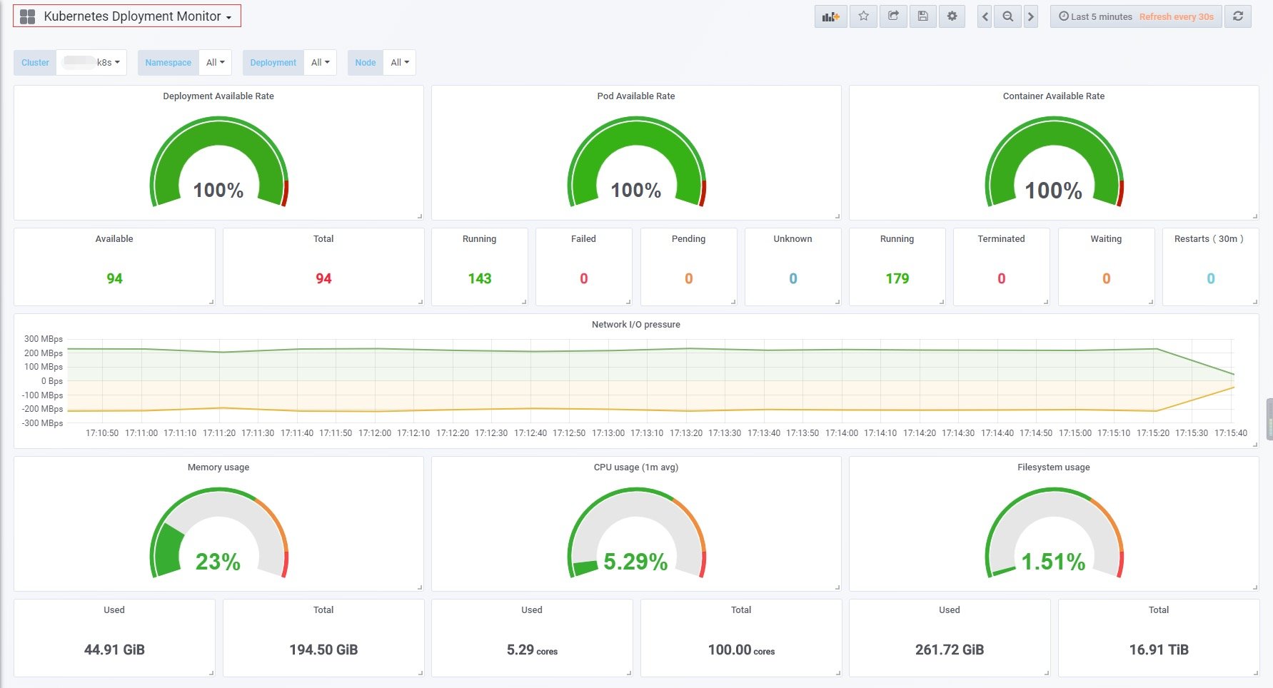 kubernetes-deployment-dashboard,展示了大多关于deployment的信息。左上角的Cluster选项就是利用prometheus-server-config.yaml中自定义的labels.k8scluster标签实现的。