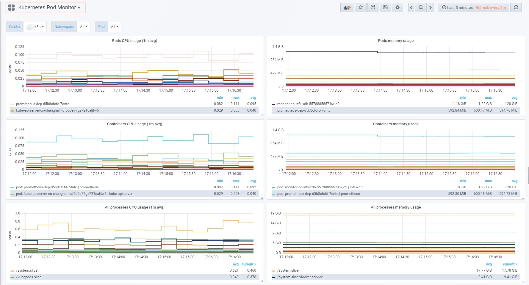 kubernetes-pod-dashboard,展示的都是关于pod和container的信息,包括CPU、mem使用监控。此页面数据量一般比较大。左上角的Cluster选项也是利用prometheus-server-config.yaml中自定义的labels.k8scluster做的。