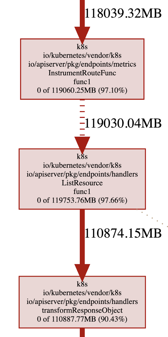 此外,我们还启用了 golang profiling 工具 pprof 和可视化堆内存占用。我们能够快速识别资源最密集的代码路径和请求模式,例如,在调用 List 资源时转换响应对象。作为 kube-apiserver OOM 调查的一部分,我们发现的另一个大问题是,kube-apiserver 使用的 page cache 也被计入了 cgroup 的内存限制,匿名内存的使用可以窃取同一 cgroup 下的 page cache。因此,即使 kube-apiserver 只有 20GB 的堆内存使用量,整个 cgroup 也会看到有 200GB 的内存使用量将触发限制。虽然目前的内核默认设置是不主动回收分配的页面以有效地重新使用,但我们目前正在研究设置基于 memory.stat 文件的监控,并强制 cgroup 在内存使用接近极限时尽可能多地回收页面。