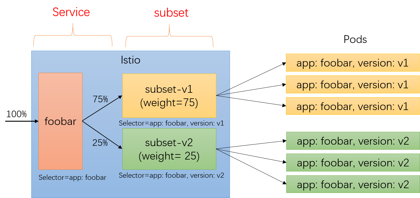 subset 在 DestinationRule 中定义,注意这里只涉及到 labels,服务(以host标志)并没有多个,还是 foobar: