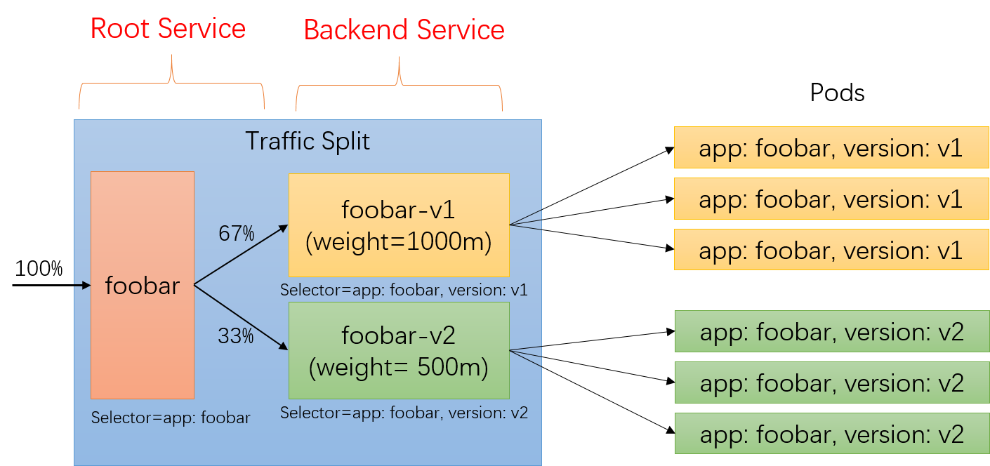 - Traffic Split:需要为每个需要拆分的流量额外增加 k8s service