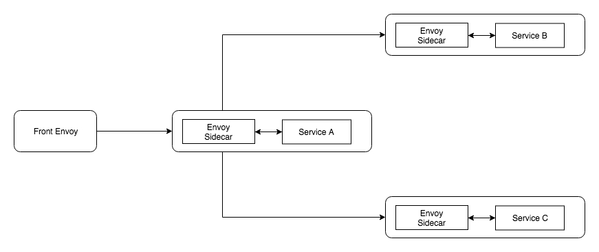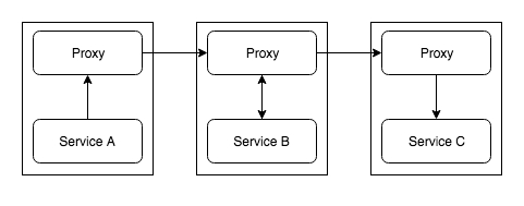 好,让我们来搭建一个由3个服务组成的 “Service Mesh”。我们要搭建的“Service Mesh”的结构如下所示,每个服务旁都设置有一个代理。