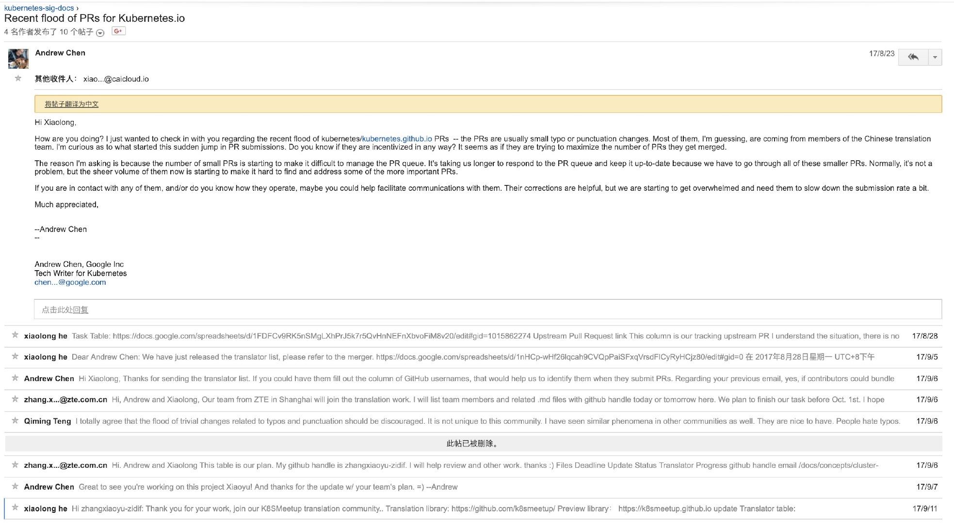 既然贡献开源社区的途径有这么多,为什么中国贡献者往往更愿意通过一步到位提交代码的方法终结贡献呢?一部分是大部分管理者衡量贡献的标准如此,像盯着股票大盘一样盯着PR数量,你多一个我少一个,另一部分是原因受限于语言表达,中国贡献者相比于国外往往和社区之间的英语沟通比较吃力所以索性以代码代替交流。一些确实很有能力的开源贡献者参与开源社区的方式却是“闷头苦干”。当然文化来讲中国自古以勤劳朴实为美德,但是社区(Community,更像国外邻里/教会这样的社区)本身不是谁种的南瓜大谁就更厉害,更不是血汗工厂。开发者参与开源社区的方式可以更“温和”一些,比如从在slack上礼貌地提出问题交流想法开始,比如从邮件列表/Google Group中寻求帮助开始。没有了解清楚背景提交的代码PR往往是“离谱”的,看来比较浅的现象后面藏着的可能是一个早前悬而未定的issue。参与开源社区,更好的姿势应该是从搜集资料发问开始以提交代码终结。